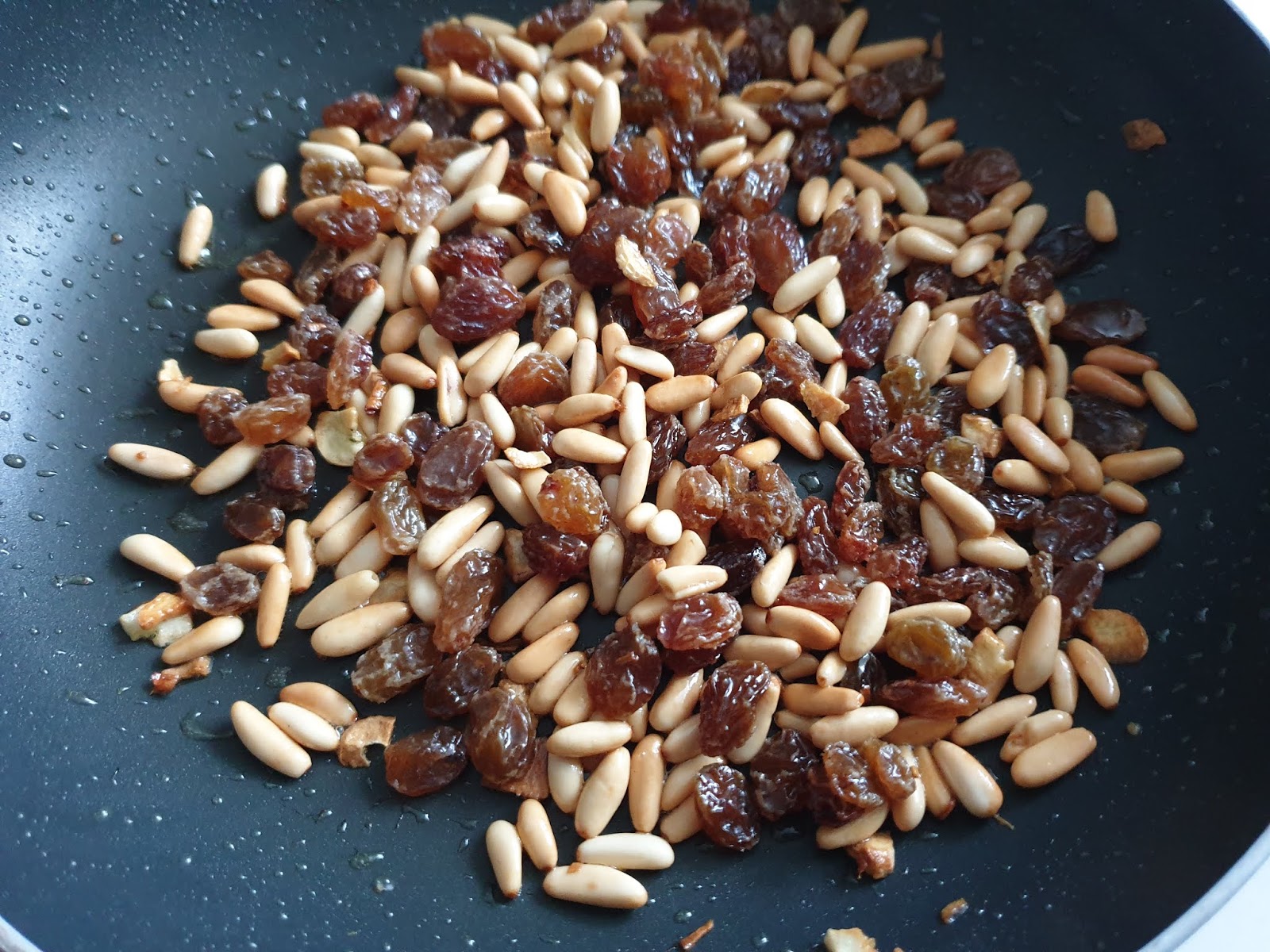 Un consejo, si me lo permite: puede mejorar el plato desde el punto de vista nutritivo si, en vez de añadir las espincas escaldadas (parte de sus minerales y la mayor parte de las vitaminas se habrán perdido en el agua caliente), añade las espinacas frescas lavadas y centrifugadas en la sartén donde están el ajo, los piñones y las pasas. No sólo no perderá nutrientes sino que podrá controlar mejor el estado final de la espinaca, dejándola más crujiente o más pasada en función de sus preferencias, y además no perderá el maravilloso color verde la espinaca, lo que redundará en un mejor aspecto del plato. Buen provecho ¡¡¡